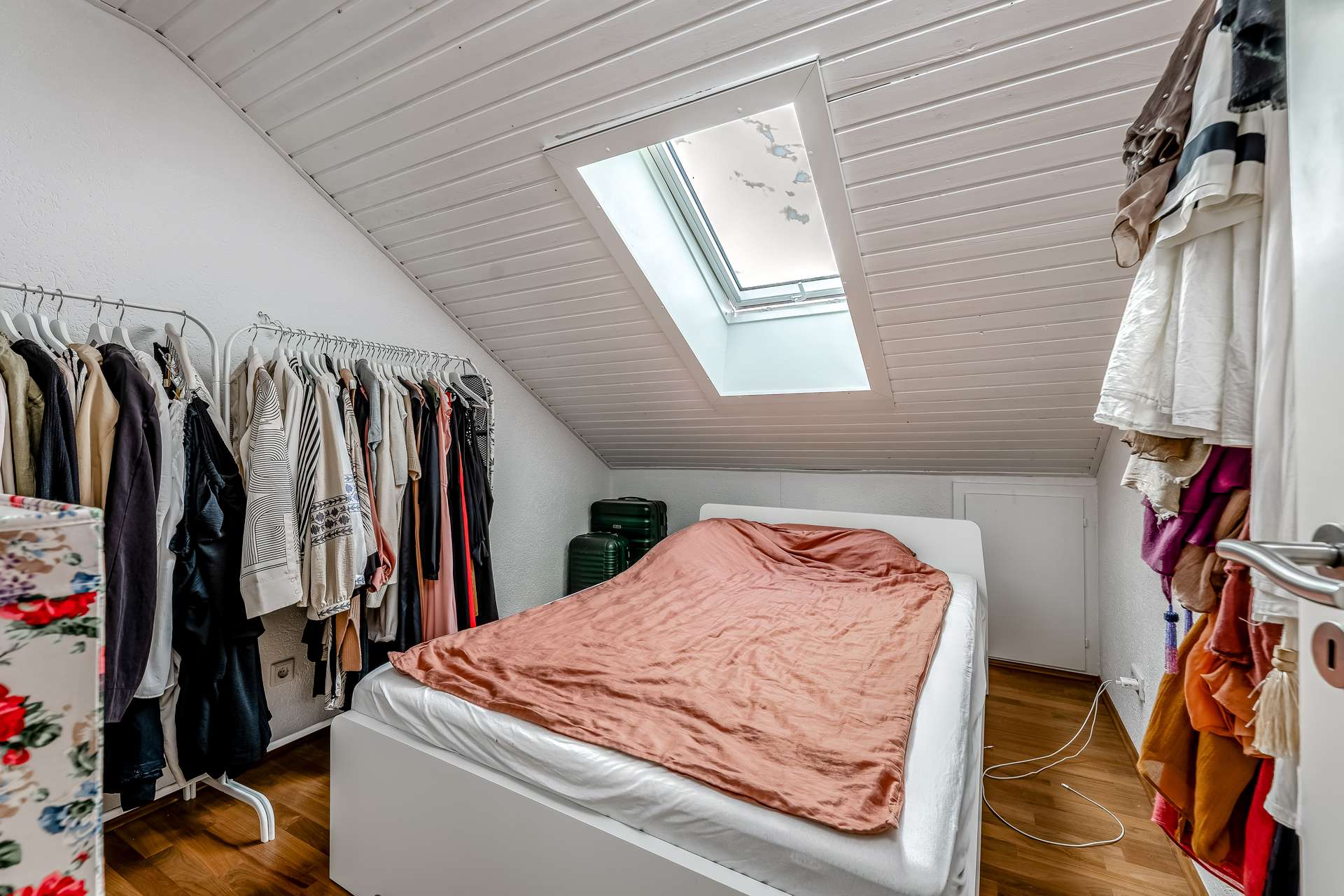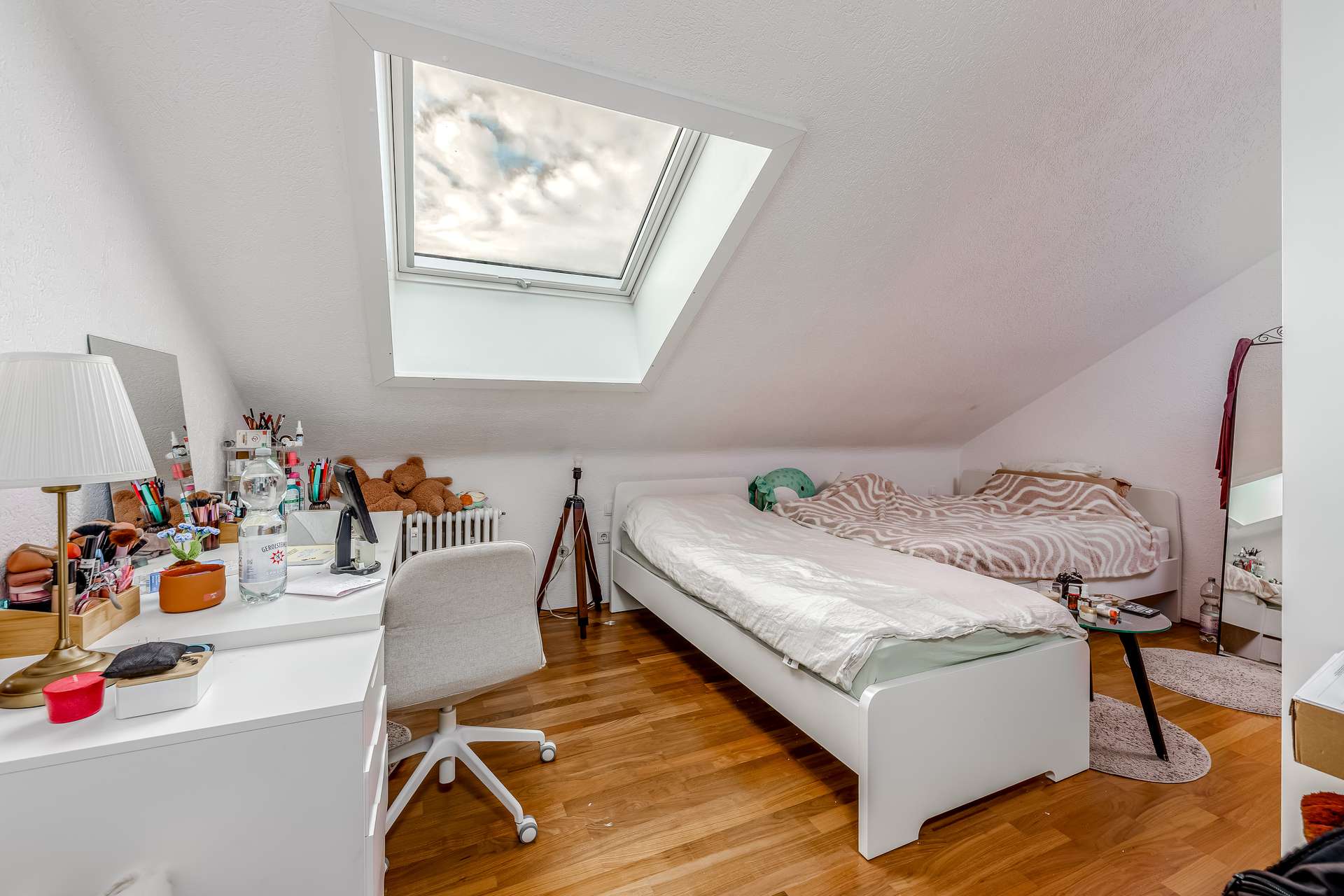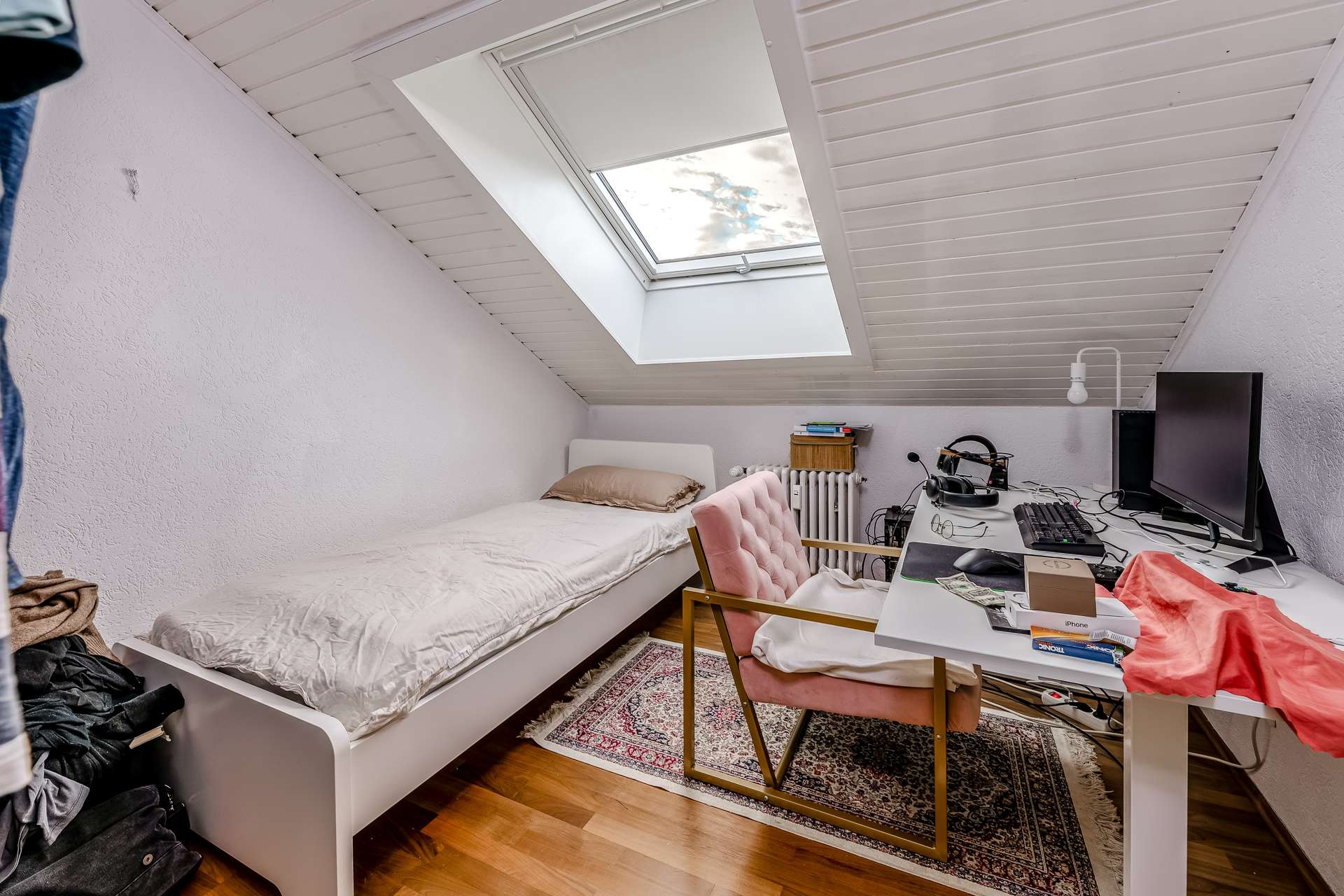 Insgesamt stehen vier geräumige Zimmer, eine separate Küche sowie ein Badezimmer zur Verfügung. Die hohen Decken mit sichtbaren Dachschrägen und großen Fenstern schaffen eine freundliche, offene Atmosphäre und lassen viel Tageslicht in alle Räume.