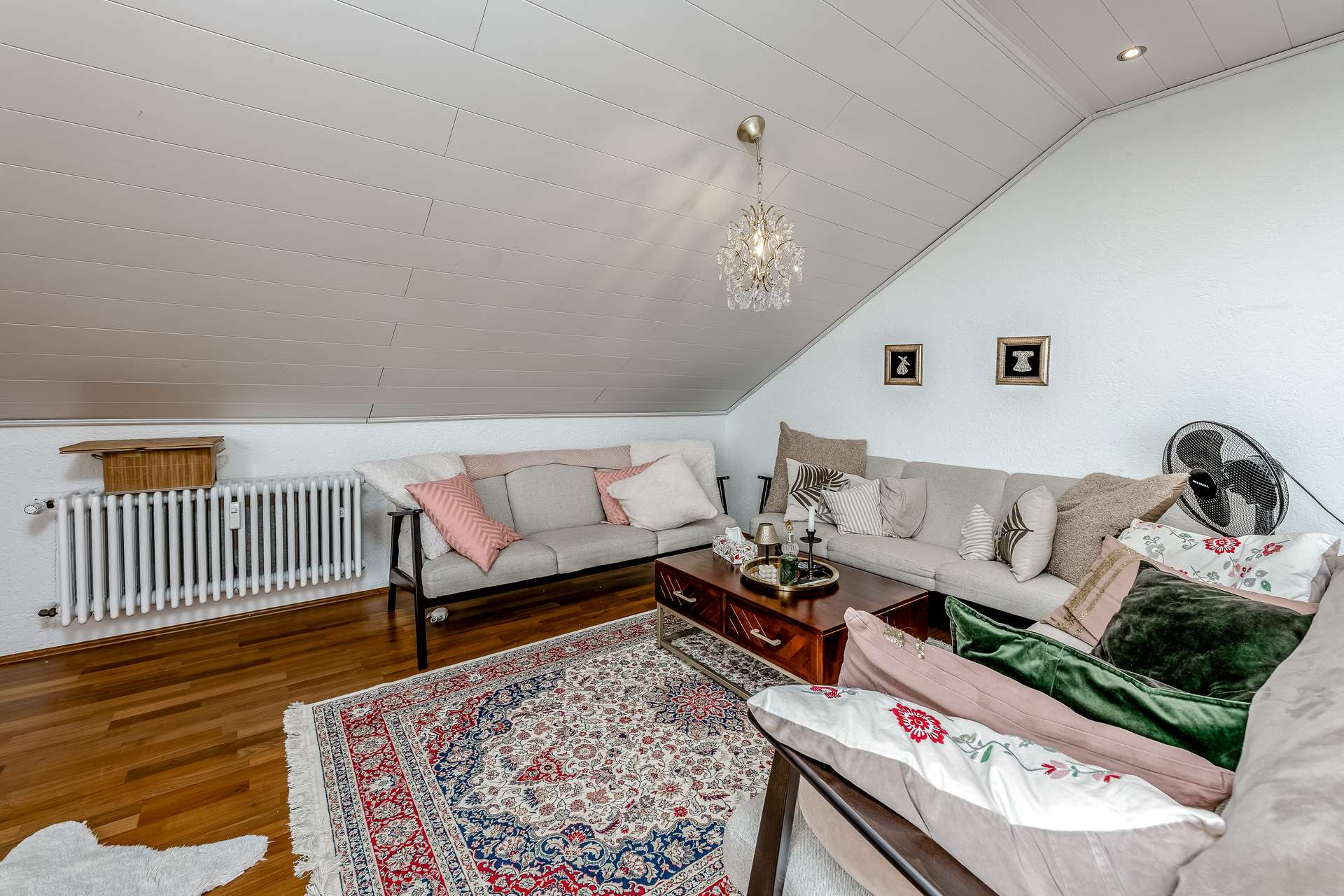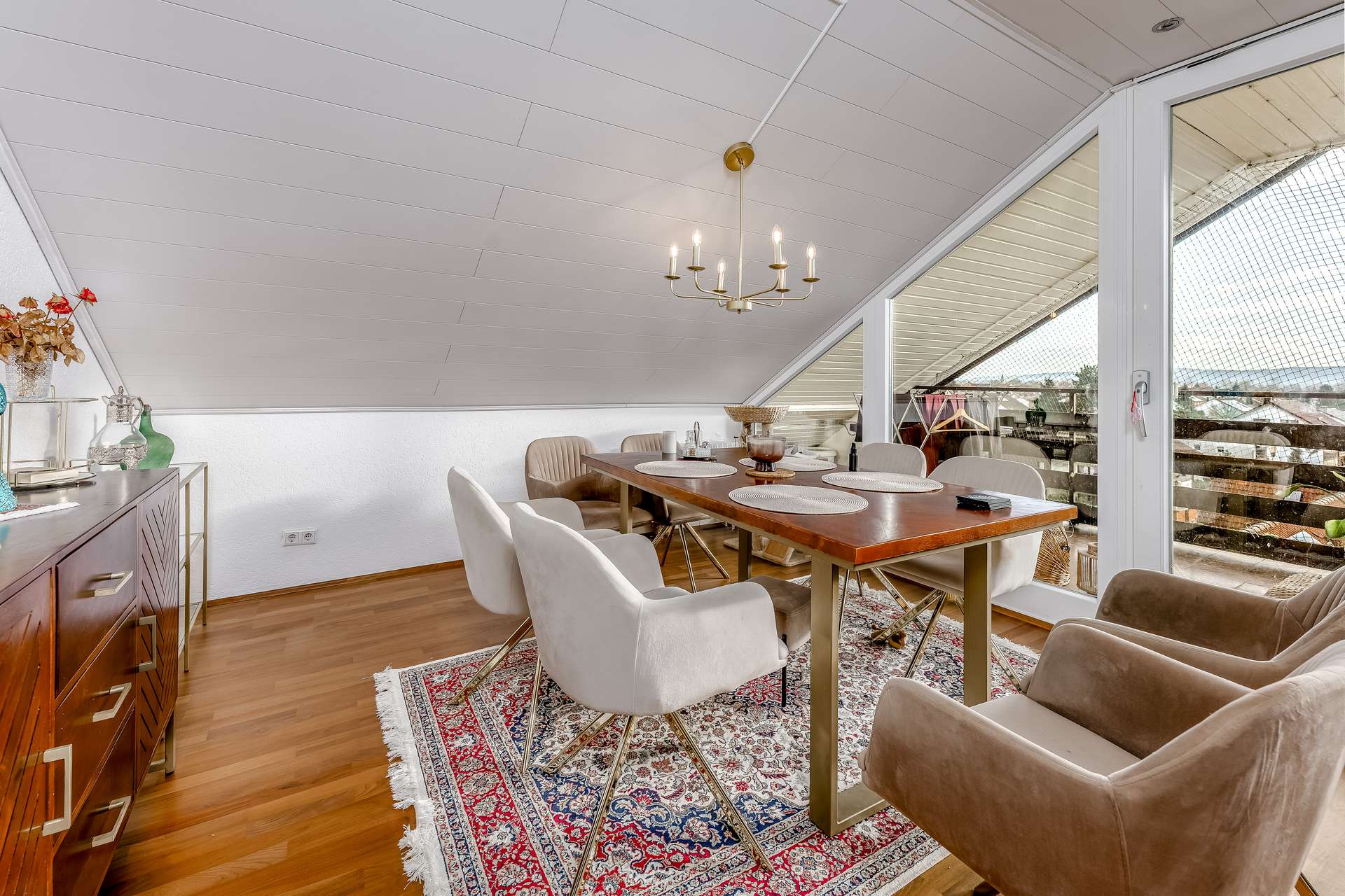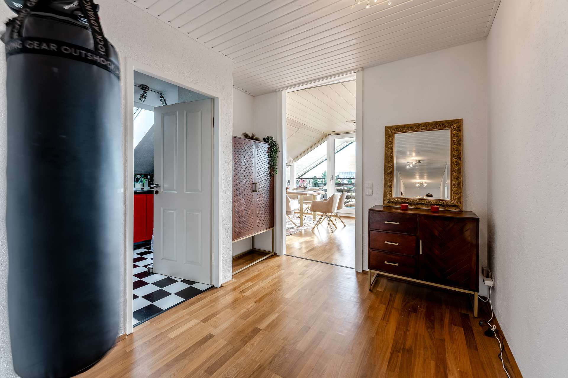 Insgesamt stehen vier geräumige Zimmer, eine separate Küche sowie ein Badezimmer zur Verfügung. Die hohen Decken mit sichtbaren Dachschrägen und großen Fenstern schaffen eine freundliche, offene Atmosphäre und lassen viel Tageslicht in alle Räume.
