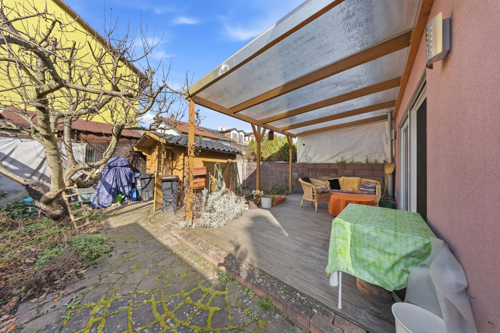 Ein weiteres Highlight ist die schöne Terrasse, die zum Verweilen im Freien einlädt. Ob gemütliches Frühstück in der Morgensonne oder gesellige Grillabende im Sommer – dieser Außenbereich erweitert den Wohnraum auf angenehme Weise. Das gepflegte Grundstück rundet das harmonische Gesamtbild ab und bietet Platz für Erholung und Freizeit.